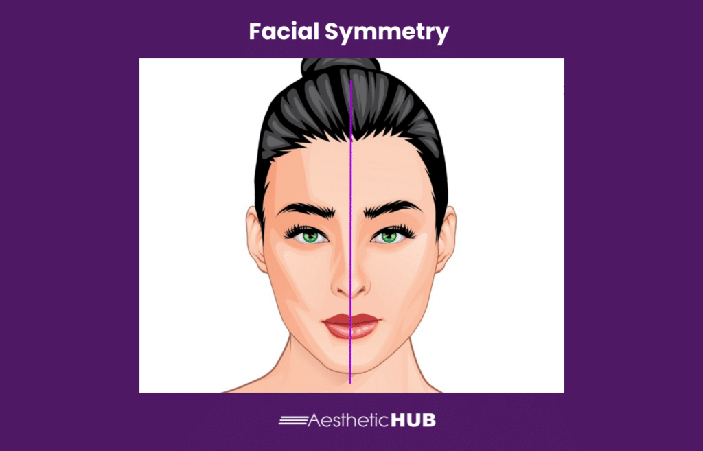 The human face is naturally asymmetrical, with slight discrepancies making faces appear more natural. Assess symmetry by drawing a median sagittal line from the middle of the philtrum to the glabella. If differences between the face halves arenโt noticeable at first glance, reassure the patient their face is appropriately symmetrical.